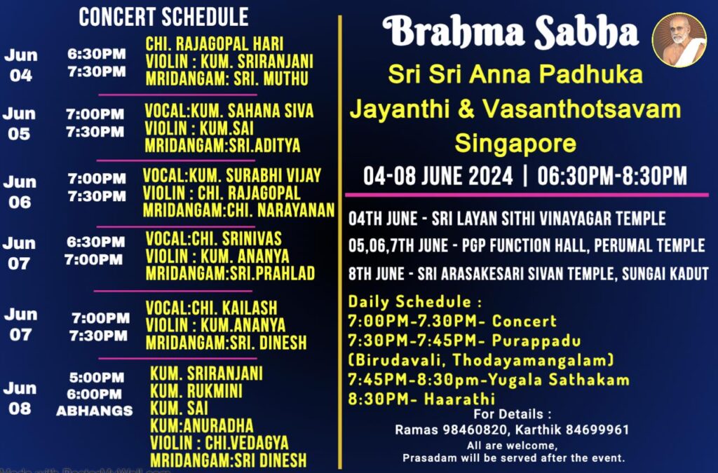 As part of our Vasantotsavam & Padhuka Jayanthi, June 5th – 7th satsang will be held at PGP Hall Function Room (3rd Floor), Sri Srinivasa Perumal Temple. Please see the flyer below for the details. Everyday we have 30 minutes cultural program (vocal concert) by kids followed by Simple purappadu (procession) and Bhajan. For prasadam logistics, we request you to kindly register. mention your attendance for each day separately. Thanks and Radhekrishna